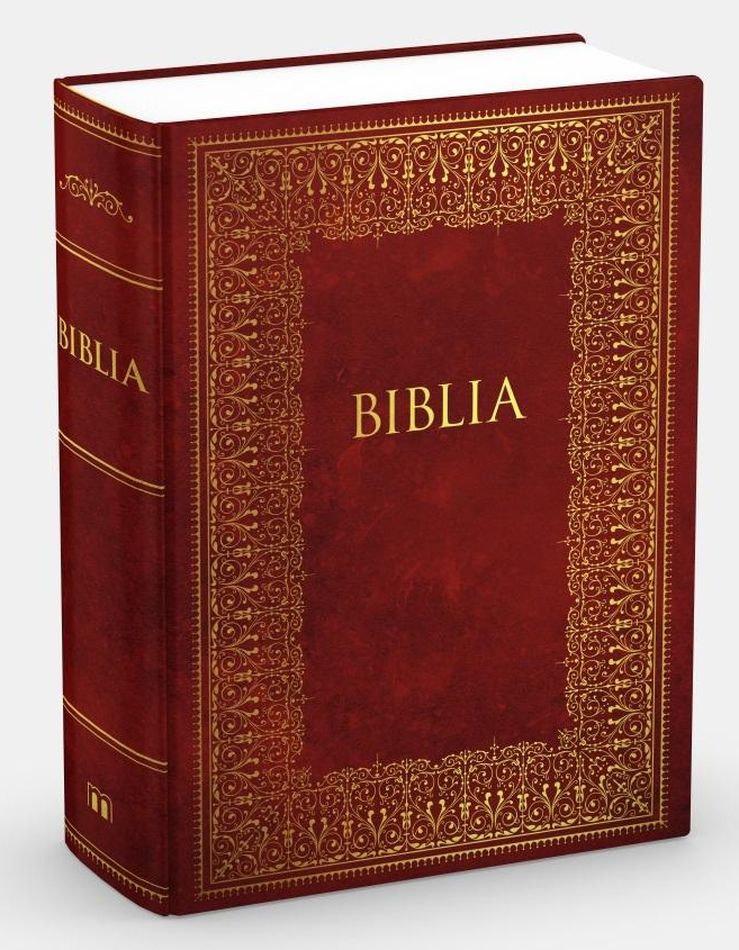 Pismo Święte posiada elegancką twardą oprawę w kolorze bordowym ze złoceniami.