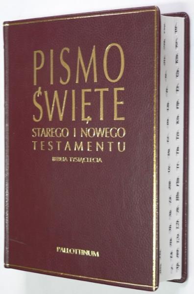 Bardzo praktyczne wydanie Biblii, z paginatorami, czyli nacięciami, dzięki którym można bardzo szybko znaleźć szukany tekst. Biblia Tysiąclecia to najpopularniejsze narodowe wydanie Pisma Świętego. Zawiera jedyny polski tekst Pisma Świętego, zatwierdzony do stosowania w liturgii przez Konferencję Episkopatu Polski, przystępne komentarze - przypisy, mapy oraz podręczny słownik biblijny. Biblia - ""Księga Życia"" - Verba Sacra - jest bez wątpienia najwspanialszym z dzieł w historii świata, bestsellerem wszechczasów. Polskie tłumaczenie z języków oryginalnych, znane pod historycznym już tytułem Biblia Tysiąclecia jest szczególnym znakiem obecności Boga i Jego Objawienia w najnowszej historii naszego narodu. Zachęcamy do ożywienia i umocnienia osobistego kontaktu z Bogiem, zapraszając do sięgnięcia po nowe, piąte wydanie Biblii Tysiąclecia. Idea ta wychodzi naprzeciw wezwaniu Kościoła zarówno do jak najczęstszego kontaktu ze Słowem Bożym, jak i do radosnego dzielenia się Dobrą Nowiną ze wszystkimi. Jak napisał Ojciec Święty: ""W ten sposób jeszcze większa rzesza ludzi będzie miała dostęp do Słowa Bożego, które jest (Rz 1,16)."" Biblia stanowi konstytutywną i egzystencjalną podstawę misyjnego posłannictwa Kościoła od początku jego istnienia. Jest stale obecna w liturgii, katechezie i ewangelizacji. Sobór Watykański II (1963-1965) proponując odnowę Kościoła akcentuje potrzebę wzięcia do ręki przez wszystkich wierzących - duchownych i świeckich - Pisma świętego. W konstytucji soborowej o Objawieniu Bożym w nr 21-25 czytamy: ""Kościół miał zawsze we czci Pisma Boże, podobnie jak samo Ciało Pańskie... Wierni winni mieć szeroki dostęp do Pisma świętego... sobór prosi wszystkich wiernych, by przez częste czytanie Pisma świętego nabywali wzniosłego poznania Jezusa Chrystusa"". Jan Paweł II przekazując w roku 1984 Biblię Tysiąclecia młodzieży akademickiej pisał: ""Przekazując Młodzieży Akademickiej w Polsce Biblię Tysiąclecia życzę, aby odnajdywała w niej Chrystusa, który jest Prawdą, Drogą i Życiem"", a obecnie przygotowując Kościół na Jubileusz 2000 roku w liście apostolskim Tertio millennio adveniente (40) pisze: ""Aby poznać prawdziwą tożsamość Chrystusa, chrześcijanie powinni powrócić z odnowionym zapałem do Biblii"". O. Augustyn Jankowski OSB - w imieniu Redakcji Naukowej - napisał o piątym wydaniu Biblii Tysiąclecia: ""Już ponad 40 lat minęło od ukazania się Biblii Tysiąclecia. Kolejne jej wydania, zwłaszcza Nowego Testamentu, zaznaczały się stale rosnącą liczbą zmian ulepszających bądź wierność przekładu, bądź wstępy do ksiąg i przypisy. W tym okresie ukazywało się w prasie sporo recenzji BT, mniej lub bardziej krytycznych, a do Redakcji Naukowej napływało wiele listów z uwagami lub propozycjami zmian. Z drugiej strony minione lata zaznaczyły się postępem w takich dyscyplinach pomocniczych dla biblistyki, jak: archeologia, historia, krytyka tekstu i filologia biblijna, nie mówiąc już o postępie w zakresie egzegezy. Nadto pojawiły się w tym czasie nowe dokumenty Urzędu Nauczycielskiego Kościoła dotyczące tej dziedziny. Wreszcie ukazało się wiele zupełnie nowych przekładów Biblii na języki współczesne. Wszystko to skłoniło Redakcję Naukową, w porozumieniu z Wydawnictwem Pallottinum, do podjęcia gruntownej rewizji tekstu BT pod każdym względem, w duchu zapoczątkowanego przez II Sobór Watykański dzieła aggiornamento. Na spotkaniach obu zespołów zwiększono w tym celu osoby skład Redakcji Naukowej oraz ustalono wytyczne podjętej rewizji. Niniejsze, piąte, wydanie zawiera następujące zmiany: 1) Wstępy do działów i do poszczególnych ksiąg oraz przypisy unowocześniono odpowiednio do osiągnięć naukowych ostatniego trzydziestolecia i do potrzeb czytelników szukających miejsc równoległych w Biblii; 2) Dokonano zmian merytorycznych samego przekładu w imię większej jego zgodności z tekstem oryginalnym, zwłaszcza hebrajskim w Starym Testamencie, odstępując od zbyt częstego poprawiania go według tekstu Septuaginty, której odmienne lekcje podano w przypisach; 3) Poprawiony i ujednolicony został język i styl przekładu, na szczególną wdzięczność zasługuje tu pani prof. Anna Świderkówna w zakresie konsultacji oraz panie redaktorki Janina Dembska, Maria Nowaczyńska i Maria Przybył. Niech to nowe, gruntownie zmienione wydanie piąte Biblii Tysiąclecia jeszcze lepiej niż poprzednie służy polskiemu czytelnikowi, który pragnie głębiej wnikać w zapisane Słowo Boże.""