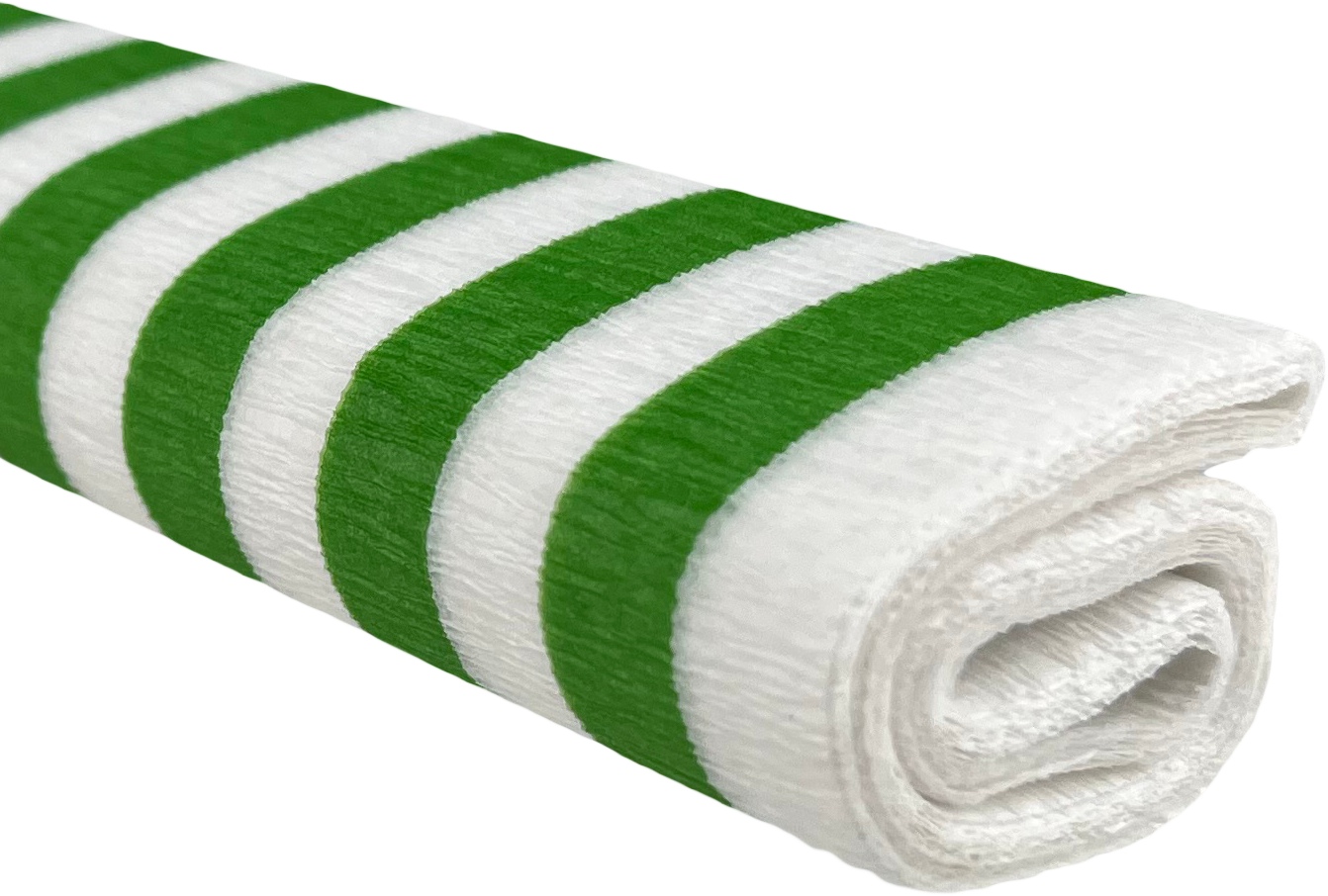 Bibuła marszczona w intensywnych kolorach z nadrukiem w zielone paski na białym tle.