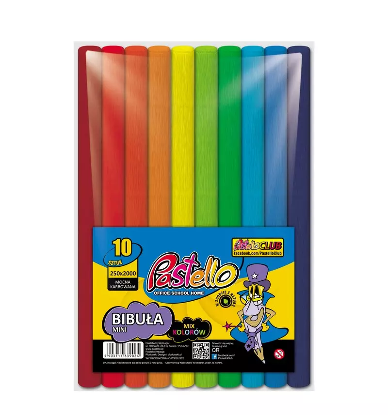 Bibuła marszczona w rolce, wysokość 25 cm, długość 200 cm. Gramatura 25 gram. Miks 10 kolorów spectrum: bordowy, czerwony, pomarańczowy, żółty intensywny, żółty, zielony dwa odcienie, niebieski dwa odcienie i fioletowy. Idealna do różnych prac plastycznych w szkole lub przedszkolu. Stosowana do prac plastycznych, dekoracji i rękodzieła.