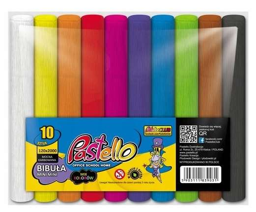 Bibuła marszczona w rolce, wysokość 12 cm, długość 200 cm. Gramatura 25 gram. Miks 10 kolorów klasycznych: biały, żółty, pomarańczowy, czerwony, różowy, fioletowy, niebieski, zielony, brązowy i czarny. Idealna do różnych prac plastycznych w szkole lub przedszkolu. Stosowana do prac plastycznych, dekoracji i rękodzieła.
