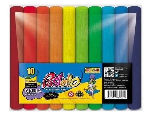 Bibuła marszczona w rolce, wysokość 12 cm, długość 200 cm. Gramatura 25 gram. Miks 10 kolorów spectrum: bordowy, czerwony, pomarańczowy, żółty intensywny, żółty, zielony dwa odcienie, niebieski dwa odcienie i fioletowy. Idealna do różnych prac plastycznych w szkole lub przedszkolu. Stosowana do prac plastycznych, dekoracji i rękodzieła.