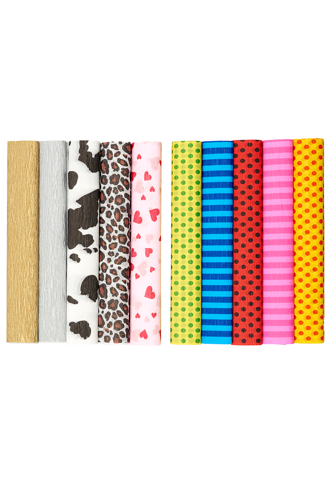BIBUŁA MARSZCZONA TOP 2000 CREATINIO 25X200 MAŁY MIX WZORY: srebro, złoto, łaty, cętki, serca, zielono żółte groszki, niebieskie paski, czerwono-czarne groszki, rożowe paski, czerwono zółte groszki KOMPLET 10 SZTUK