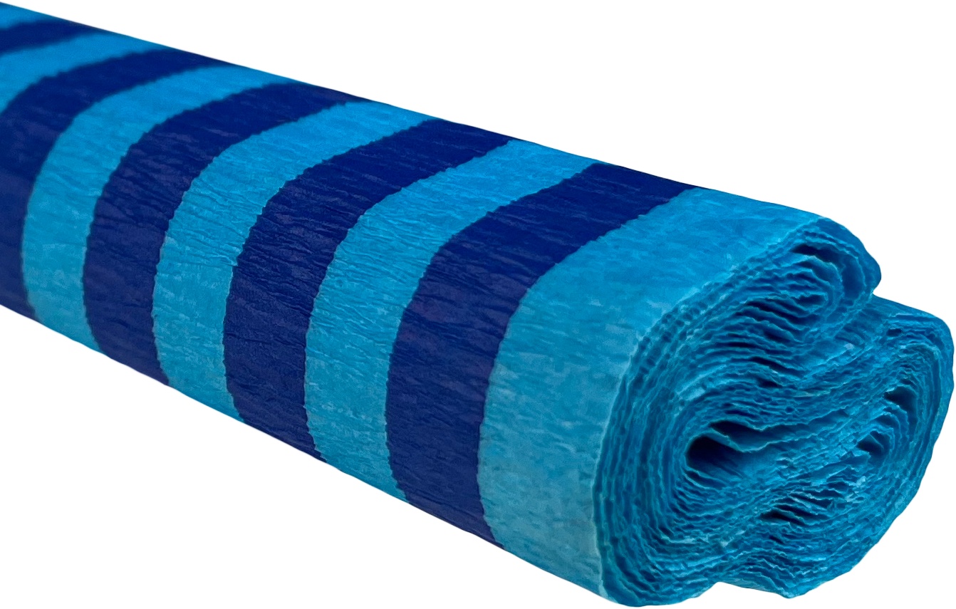 Bibuła marszczona w intensywnych kolorach z nadrukiem w niebieskie paski na turkusowym tle.