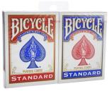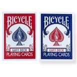 2 talie 55 kart w rozmiarze pokerowym 63 x 89mm (52 + 2 jokery + info card) Standardowy indeks na przeciwległych rogach awersu. Nowe talie, zapakowane, sygnowane logiem Bicycle. Dostępne w kolorze czerwonym i niebieskim. Każda talia wykonana jest z własnego, unikatowego papieru oraz powlekana specjalistycznym tworzywem. Dzięki temu klienci od wielu lat ufają produktom Bicycle. Wyłączną cechą karty Bicycle jest wykończenie kart metodą „Air Cushion”. Ta sekretna formuła sprawia, że karty Bicycle mają dłuższą żywotność, łatwiej się je tasuje, rozdaje co znacznie uprzyjemnia karcianą rozgrywkę!
