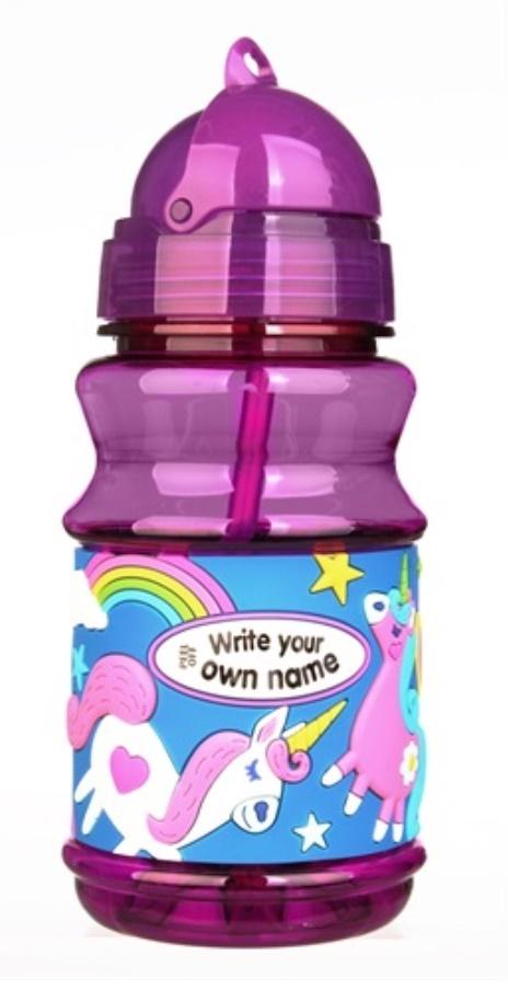 Mały i poręczny bidon idealny z mechaniczną klapką, która zabezpiecza przed pęknięciem. Bidon idealny do plecaka lub zestawu śniadaniowego. Bidon owinięty jest wypukłą owijką 3D z PCV z miejscem na wpisanie własnej nazwy.