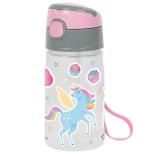 Przezroczysty bidon z nadrukiem o pojemności 330ml. Bidon wykonany z bezpiecznego i wytrzymałego na upadek tworzywa, wolnego od BPA. Posiada chowany ustnik oraz pokrywkę zabezpieczającą, która otwiera się przy pomocy przycisku. Bidon posiada poręczny kształt idealny dla dziecięcej ręki