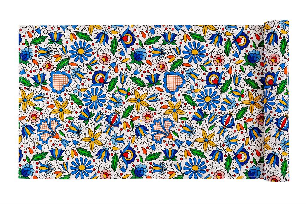 Bieżnik w kaszubskie kwiaty: wykonany ze 100 % bawełny,biały z nadrukowanymi kolorowymi kwiatami kaszubskimi,zachwyca intensywną gamą kolorów, zalecamy prać w temp. 40 , prasować w max. temp. 160 ,