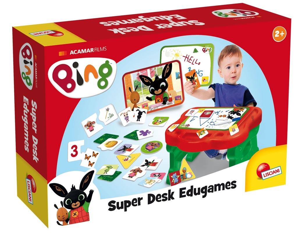 Wielofunkcyjne biurko małego geniusza, będzie świetnym pomocnikiem w rozwoju. Zestaw rozwija pamięć, wyobrażnię i logiczne myślenie, uczy: literek, cyferek, kolorów, kształtów oraz czytania. W zestawie znajduje się: biurko edukacyjne, gry pamięciowe gry edukacyjne, mini puzzle, suchościeralna tablica marker do tablicy, instrukcje. Naukowa zabawa z ulubionym bohaterem z bajki Bing. Zestaw przeznaczony dla dzieci w wieku 2+