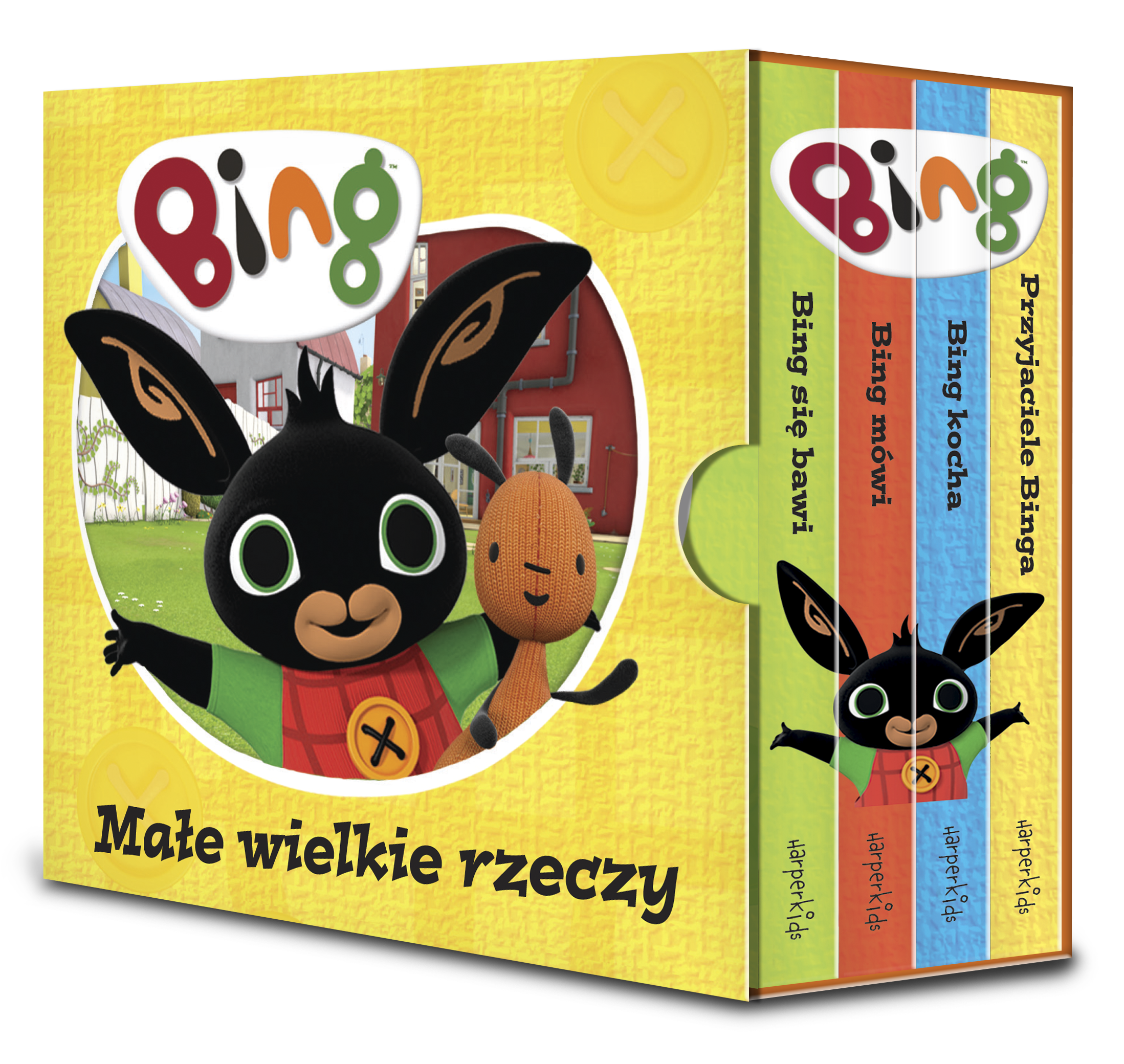 Kartonowe strony nie brudzą się łatwo, są wytrzymałe i odporne na najróżniejsze dziecięce pomysły! Dzięki zaokrąglonym rogom książki są bezpieczne nawet dla bardzo małych dzieci. W serii dostępny jest również drugi tytuł kolekcja czterech książeczek, dzięki którym Bing pomoże dziecku przygotować się do snu!