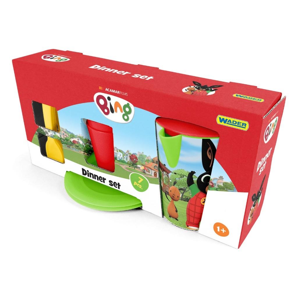 83102 BING ZESTAW NACZYŃ OBIADOWY Zestaw naczyń obiadowy z wizerunkami bohaterów bajki Bing spodoba się każdemu miłośnikowi zabaw w gotowanie i organizowanie przyjęć i będzie doskonałym uzupełnieniem dziecięcej kuchni. Zestaw składa się z 11 elementów: dzbanka z grafiką IML, 2 kubków, 2 talerzyków, 2 widelców, 2 noży i 2 łyżeczek. Całość jest starannie wykończona i bezpieczna w użytkowaniu - naczynia są dopuszczone do kontaktu z żywnością, można używać ich w kuchence mikrofalowej i myć w zmywarce. Komplet naczyń spakowany jest w elegancki kartonik z nadrukiem wizerunków królika Binga i jego przyjaciół, wykrojony tak, żeby wszystkie elementy były widoczne. Zestaw naczyń obiadowy z wizerunkami bohaterów bajki Bing spodoba się każdemu miłośnikowi zabaw w gotowanie i organizowanie przyjęć i będzie doskonałym uzupełnieniem dziecięcej kuchni. Zestaw składa się z 11 elementów: dzbanka z grafiką IML, 2 kubków, 2 talerzyków, 2 widelców, 2 noży i 2 łyżeczek. Twoje dziecko będzie teraz mogło zaprosić koleżanki i kolegów lub organizować przyjęcie urodzinowe dla lalek. Wspólne przygotowywanie i organizacja spotkań towarzyskich pozytywnie wpływa na rozwój społeczny najmłodszych, uczy współdziałania, nawiązywania relacji z rówieśnikami. Zabawa z wykorzystaniem zestawu naczyń pobudza wyobraźnię i twórcze myślenie najmłodszych, rozwija ich umiejętności manualne, motoryczne i koordynacje wzrokowo-ruchową. Całość jest starannie wykończona i bezpieczna w użytkowaniu - naczynia są dopuszczone do kontaktu z żywnością, można używać ich w kuchence mikrofalowej i myć w zmywarce. Komplet naczyń spakowany jest w elegancki kartonik z nadrukiem wizerunków królika Binga i jego przyjaciół, wykrojony tak, żeby wszystkie elementy były widoczne. w skład zestawu wchodzi 11 elementów: dzbanek z grafiką IML, 2 kubki, 2 talerzyki, 2 widelce, 2 noże i 2 łyżeczki. Dzbanek z grafiką IML z bohaterami kochanej przez dzieci bajki Bing wszystkie elementy wykonane są z certyfikowanych, trwałych i bezpiecznych elementów wyprodukowanych zgodnie z normami unijnymi dzięki czemu są bezpieczne i nadają się do kontaktu z żywnością, można używać ich w kuchence mikrofalowej i myć w zmywarce zestaw daje możliwość zabawy w grupie rówieśników, w rodzinie czy też w pojedynkę zabawa z wykorzystaniem zestawu naczyń pobudza wyobraźnię i twórcze myślenie dziecka, wspiera umiejętności społeczne, integrację z rówieśnikami oraz poprawia koordynację wzrokowo-ruchową, motorykę, umiejętności manualne i precyzję ruchów odpowiedni dla dzieci 1+