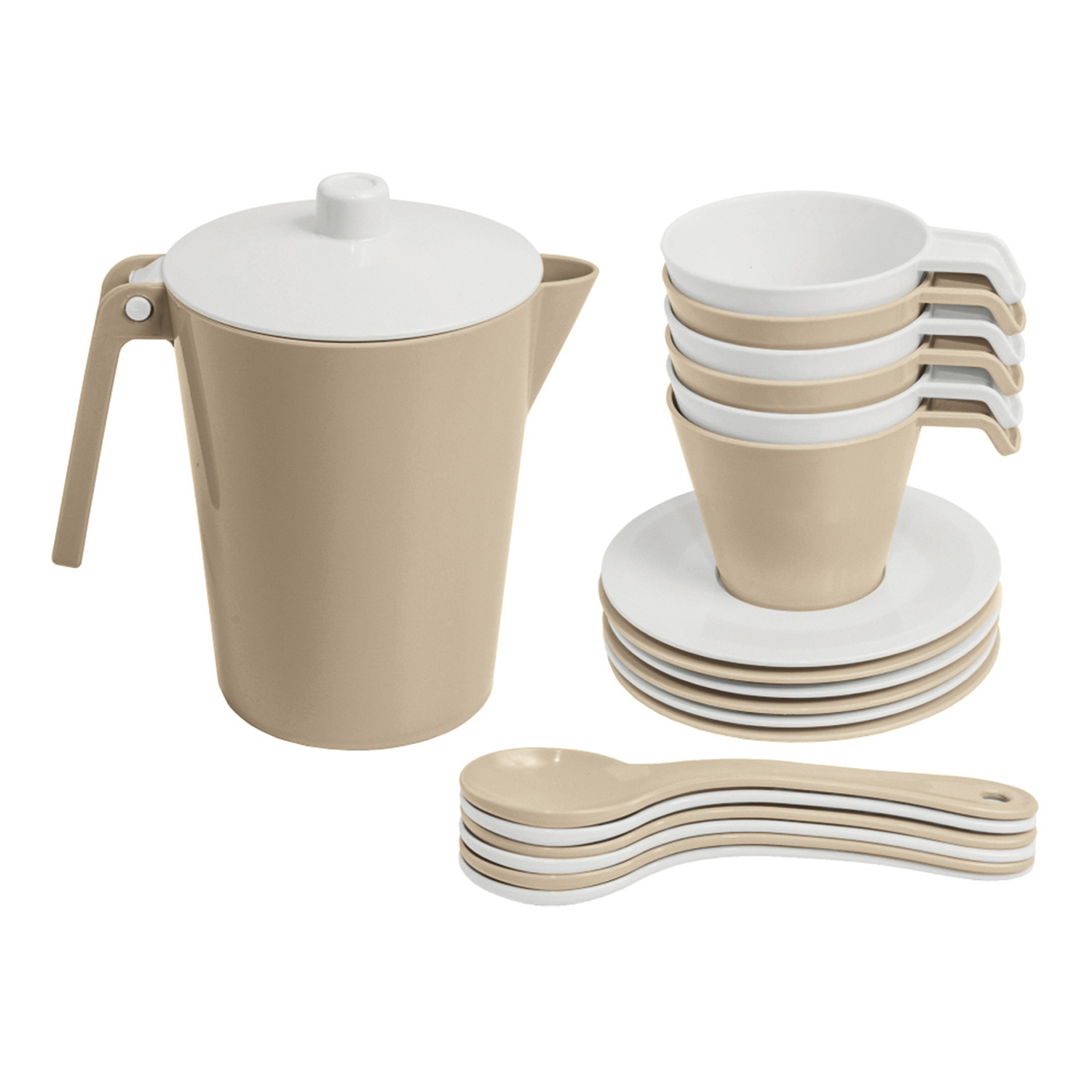 Serwis kawowy z serii Toys in Trends w kolorach jasnego beżu, mlecznej szarości oraz bieli to niezastąpiona zabawka dla każdego dziecka, które lubi bawić się w odgrywanie ról. Idealnie nadaje się na kameralne spotkanie na herbatkę dla 6 osób, a mała gospodyni będzie mogła w zabawny sposób nauczyć się zasad etykiety i nakrycia stołu. Zestaw składa się z 19 elementów: dzbanka, 6 filiżanek, 6 talerzyków, 6 łyżeczek. Zestaw jest starannie wykończony i bezpieczny w użytkowaniu - naczynia są dopuszczone do kontaktu z żywnością, można używać ich w kuchence mikrofalowej i myć w zmywarce.
