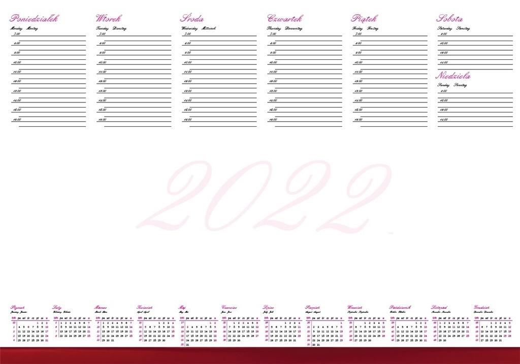 Elegancki podkład na biurko z dużym obszarem do notowania drukowany na papierze kremowym, zabezpieczony listwą wykonaną z PCV w kolorze bordowym. Na listwie istnieje możliwość wykonania nadruku reklamowego na obszarze o wymiarach 550 x 40 mm. Biuwar posiada 52 karty (1 karta przeznaczona na każdy tydzień).