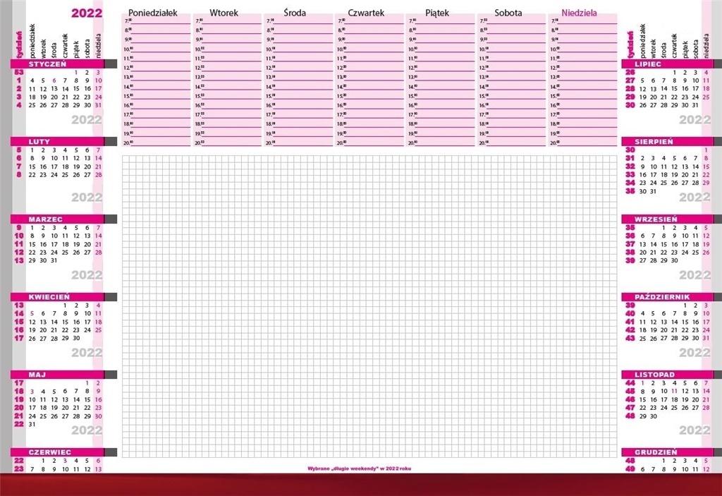 Praktyczny podkład na biurko z dużym obszarem do notowania zaprojektowany specjalnie do biura. Drukowany na białym papierze. Zawiera 52 karty (1 karta przeznaczona na każdy tydzień). Biuwar posiada uchylną listwę wykonaną z PCV w kolorze bordowym, na której można zamieścić nadruk reklamowy na obszarze o wymiarach 550 x 40 mm.
