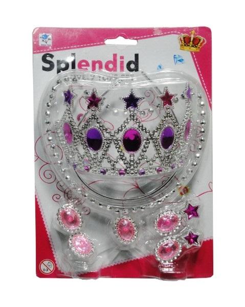 Zestaw dla małej księżniczki, korona + biżuteria będzie stanowić idealne uzupełnienie stroju. W zestawie znajduje się korona wraz z kolczykami, pierścionkiem i naszyjnikiem. Produkt zapakowany w przezroczyste opakowanie. Zestaw przzenaczony dla dzieci od 3 lat.