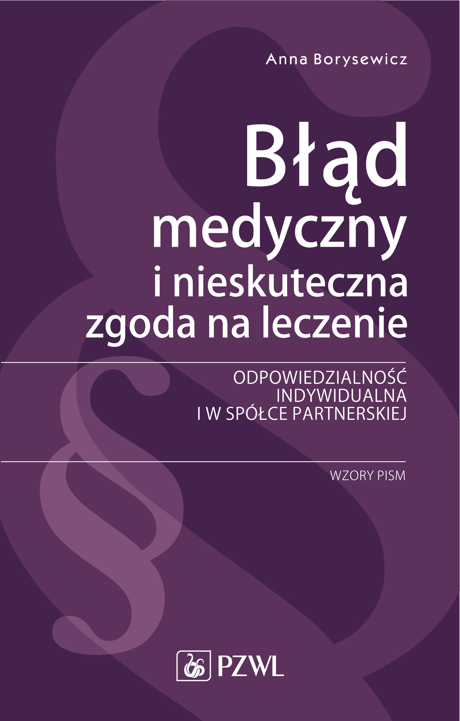 Publikacja „Błąd medyczny i nieskuteczna zgoda na leczenie. Odpowiedzialność indywidualna i w spółce partnerskiej. Wzory pism” zawiera liczne przykłady sytuacji, w jakich może znaleźć się lekarz czy podmiot leczniczy. Jest to przewodnik po wycinku prawa, dzięki któremu każdy świadczący usługi lecznicze będzie wiedział, jak się ubezpieczyć, jakie ma prawa i obowiązki. W książce poruszono zagadnienia dotyczące między innymi odpowiedzialności lekarza na gruncie prawa cywilnego i karnego, odpowiedzialności zawodowej, ubezpieczeń od odpowiedzialności za błąd medyczny, Wojewódzkich Komisji ds. Orzekania o Zdarzeniach Medycznych, a także odpowiedzialności za błąd medyczny w spółce partnerskiej. Opracowanie Pani Anny Borysewicz ma charakter poradnika adresowanego do lekarzy. Praca jest sporządzona przystępnym językiem, którego odbiór nie powinien nastręczać trudności czytelnikowi. (…) Zawiera liczne przykłady ilustrujące prezentowane rozwiązania prawne oraz jest wzbogacone o wzory pism procesowych, które mogą być przydane w ewentualnym sporze sądowym. Książka posiada istotne walory praktyczne, zwłaszcza dla osób, które nie zajmują się profesjonalnie prawem. Fragment z recenzji dr. hab. Rafała Kubiaka, prof. UŁ Przez pojęcie „błąd medyczny” należy rozumieć odstępstwo od przyjętych standardów postępowania lekarskiego, wytyczonych aktualną wiedzą i doświadczeniem medycznym, które prowadzi do negatywnych skutków dla zdrowia lub życia osoby poddanej zabiegowi medycznemu. Przy czym obejmuje nie tylko błąd terapeutyczny (tj. w leczeniu, w tym błąd operacyjny), ale także błąd diagnostyczny (czyli błąd rozpoznania). Ofiara błędu medycznego może zaś w przyszłości domagać się zapłaty od lekarza (szpitala bądź jego ubezpieczyciela) odszkodowania, zadośćuczynienia, renty, a także ustalenia odpowiedzialności pozwanej strony za skutki błędu. Obowiązki lekarza ponadto nie kończą się z chwilą dokonania zabiegu, ponieważ pacjent powinien być objęty nadzorem pooperacyjnym, zwłaszcza gdy w jego przebiegu doszło do powikłań.