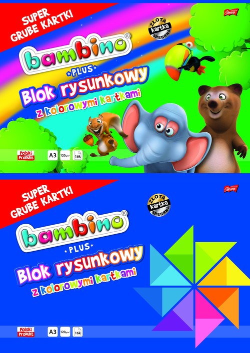 Blok zawiera 16 kolorowych kartek o gramaturze 100 g/m2. Kartki barwione w masie w kolorach żółty, różowy, pomarańczowy, czerwony, jasnozielony, ciemnozielony, jasnoniebieski, ciemnoniebieski, złoty i srebrny. Okładka kredowa wykorzystuje najnowsze motywy wzornicze licencji BAMBINO. Dla podkreślenia, jakości wykończenia okładka jest dodatkowo nabłyszczana. Całość usztywniona tekturowym podkładem. Licencja – BAMBINO Format – A3 Ilość kartek – 16