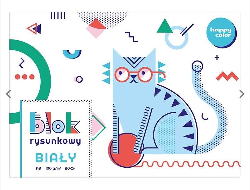 Biały blok rysunkowy marki Happy Color. 20 arkuszy o gramaturze 100g w formacie A3. Do kredek, ołówków i farb polecany do zajęć w szkole i przedszkolu.