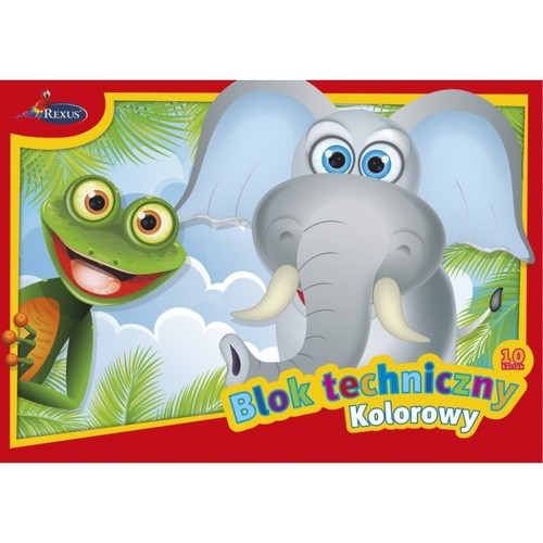 BLOK TECHNICZNY KOLOROWY, format A3 (dokładne wymiary 41,7 cm x 29,5 cm), 10 kolorowych kartek - kolory nasycone: czerwony, żółty, pomarańczowy,niebieski, ciemny różowy, zielony, granat, fiolet, brązowy i czarny. Kolorowa przednia okładka, tył z tektury, klejony z boku. Pakowany po 5 sztuk w zgrzewce