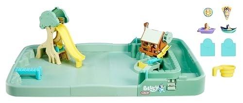 6 SZCZEGÓŁOWYCH AKCESORIÓW  Zestaw do zabawy wodą zawiera stolik, cztery pływające figurki Bluey, foremkę kraba, foremkę aligatora, łopatkę do piasku i kubek do nabierania wody.