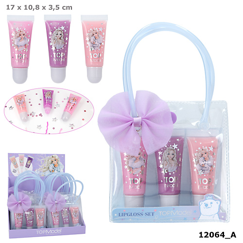 Zestaw trzech błyszczyków w plastikowej torebce Top Model, w delikatnych różowych odcieniach.