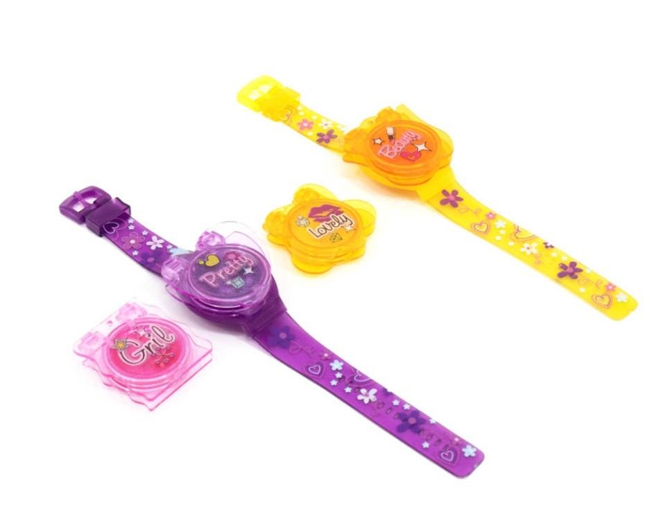 - Dostępny jest w dwóch kolorach (Fioletowym i żółtym) - Posiadają po 2x błyszczyki do ust - Łatwo schodzi -*Nie stosować w okolicach oczu - Zegarek przeznaczony jest dla dzieci powyżej 3 roku życia.