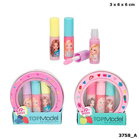 Okrągłe metalowe pudełko zawierające trzy mini błyszczyki z pędzelkiem do łatwej aplikacji z niezwykle popularnej kolekcji TOP Model.
