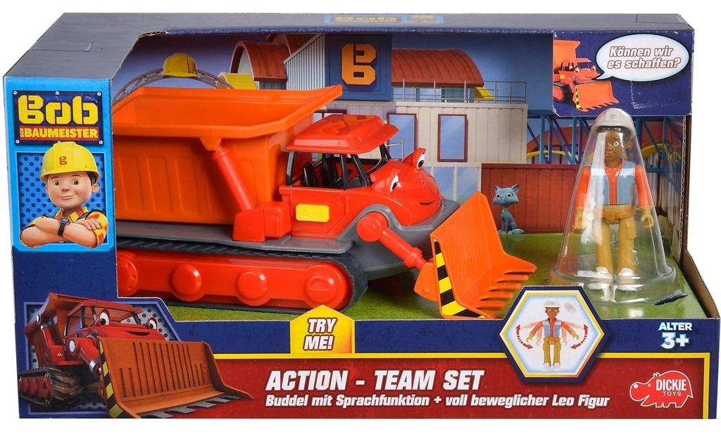 -Spychacz Boba w kolorze czerwono-pomarańczowym (ang. Muck), wyposażony w ruchomą łopatę, ruchomą wywrotkę, cztery ruchome, plastikowo-gumowe kółka oraz żółty przycisk uruchamiający efekty dźwiękowe - ponad 10 fraz w języku polskim oraz dźwięki pracy spychacza;