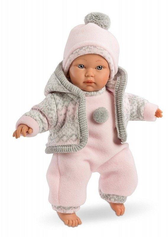 Nasza lalka wykonana jest z wysokiej jakości materiałów. Jej ciało zrobione jest z przyjemnego w dotyku winylu a brzuszek wypełniony miękką wyściółką. Po naciśnięciu brzuszka bobas zapłacze i zawoła: mama, papa!Główkę naszej lalki zdobi różowa czapeczka z pomponem. Bobas ubrany jest w różową piżamkę z szarym pomponem i szarymi elementami, różowo-szarą narzutkę w gwiazdki z kaputrem. Lalka zapakowana jest w kartonowe pudełko, idealne na prezent