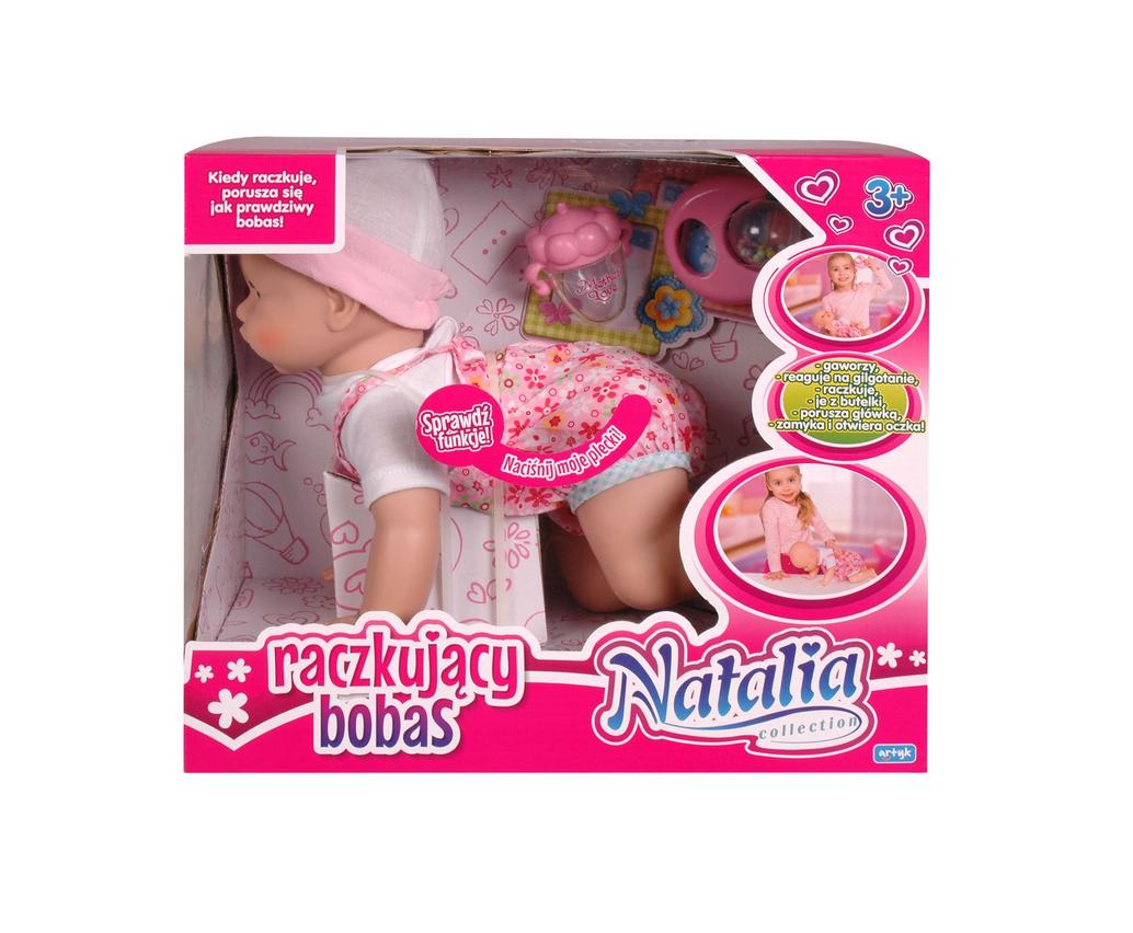 Niesamowity bobas, który potrafi raczkować, wiercić się, gaworzyć, wypowiadać pojedyncze frazy i pić z butelki. Można ustawiać wysokość jego głowy, w zależności od tego, czy chcesz, by jadł, wygodnie leżał tudzież raczkował. A kiedy raczkuje, rusza pupą jak prawdziwy dzidziuś!