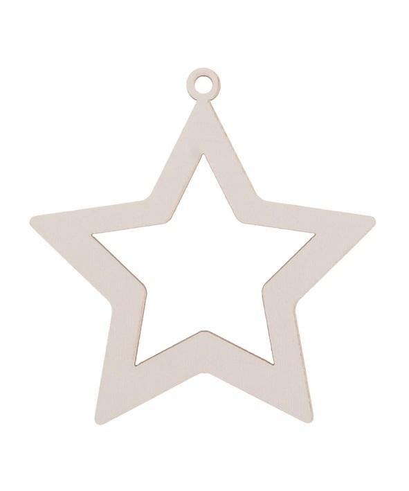 Drewniana bombka w kształcie gwiazdy biała. Średnica 8cm, wysokość całkowita 9cm. W opakowaniu 3szt