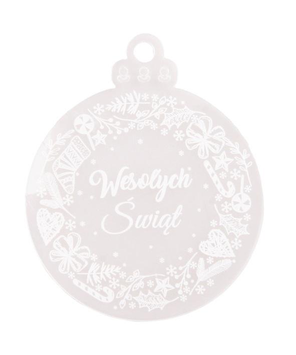Bombka wykonana z przezroczystej plexi z białym nadrukiem. Średnica 8cm, wysokość całkowita 10cm. W opakowaniu 1szt