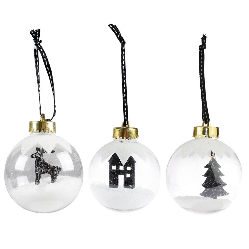 Transparentna bombka z czarnymi dodatkami i sztucznym śniegiem. Wielkość 8 cm.