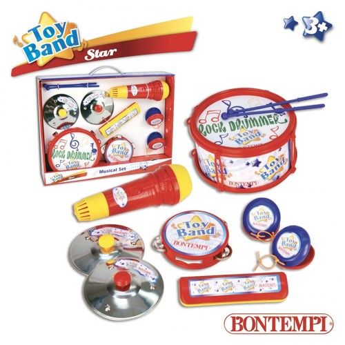 Zestaw instrumentów muzycznych firmy Bontempi, w którego skład wchodzi bębenek z dwiema pałeczkami, tamburyn, 2 kastaniety, harmonijka, 2 talerze oraz mikrofon.