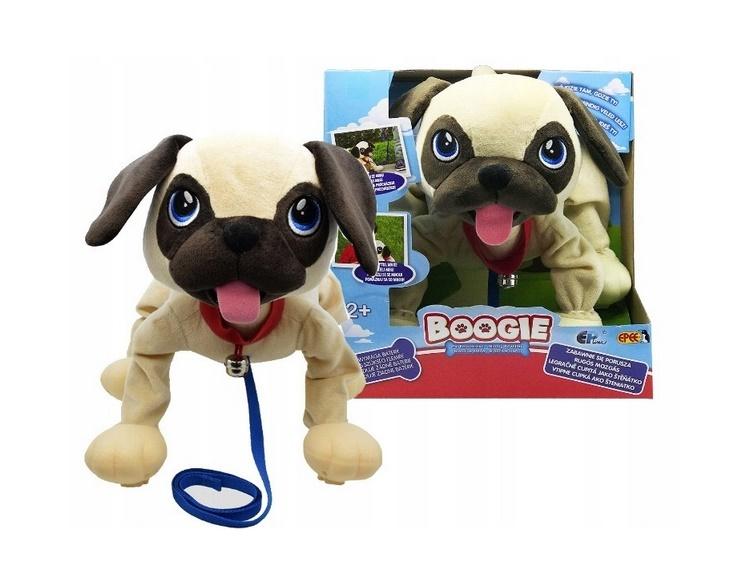 Boogie - Psi Rozrabiaka to jedyny pluszowy psiak, który pójdzie tam, gdzie Ty! Dzięki zupełnie nowej technologii, Boogie spaceruje, biega i wykonuje sztuczki, jak prawdziwy pies! Do całej zabawy nie są wymagane baterie. Mały przyjaciel będzie zabawnie mknąć za tobą zawsze i wszędzie - wystarczy pociągnąć go za smycz.
