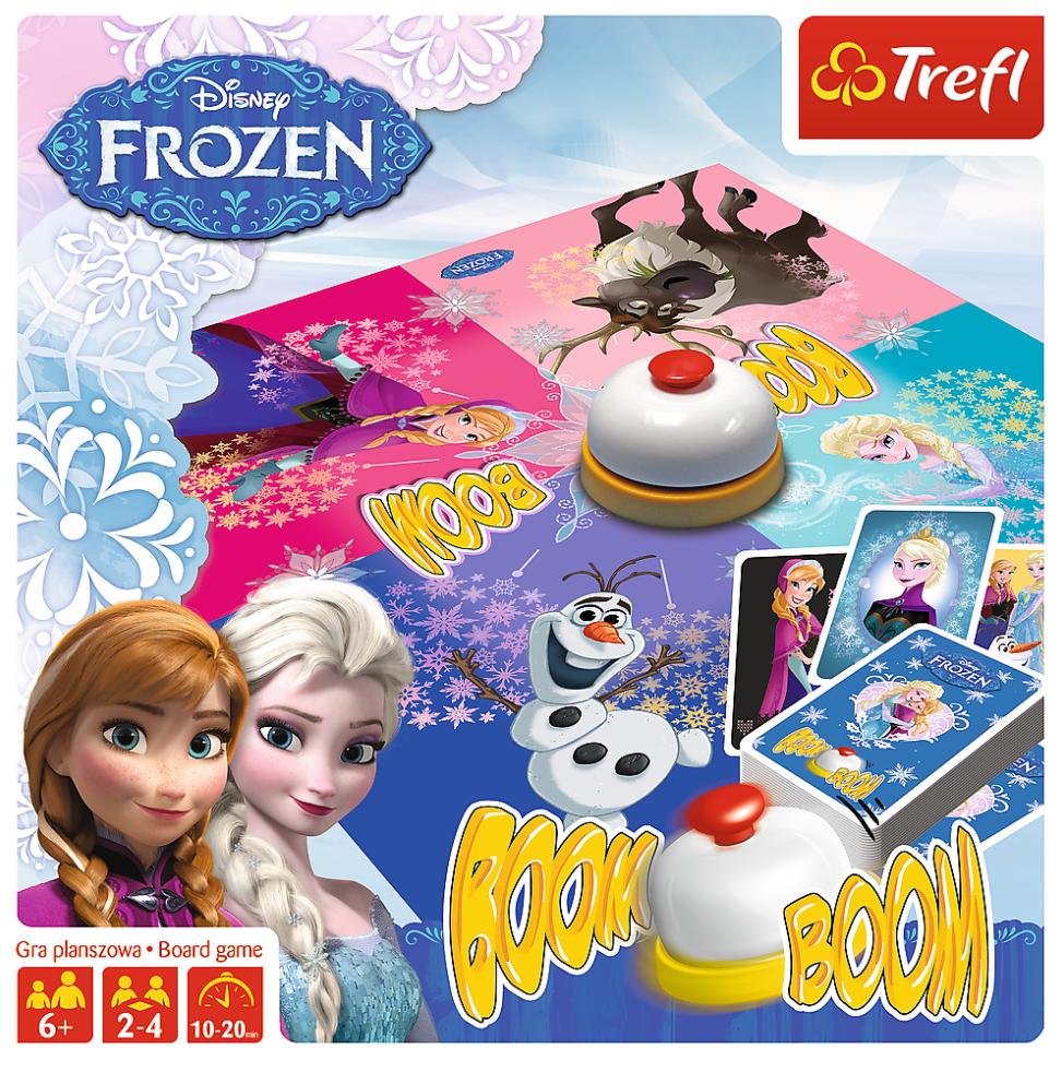 Boom Boom Frozen 2 to prosta i szybka gra dla całej rodziny. Skompletuj stosik kart i zadzwoń dzwonkiem! Musisz ułożyć wszystkie swoje zestawy kart z bohaterami filmu „Kraina Lodu II”. Zawartość pudełka: plansza, 52 karty, dzwonek, instrukcja Liczba graczy 2-4 Wiek 6+