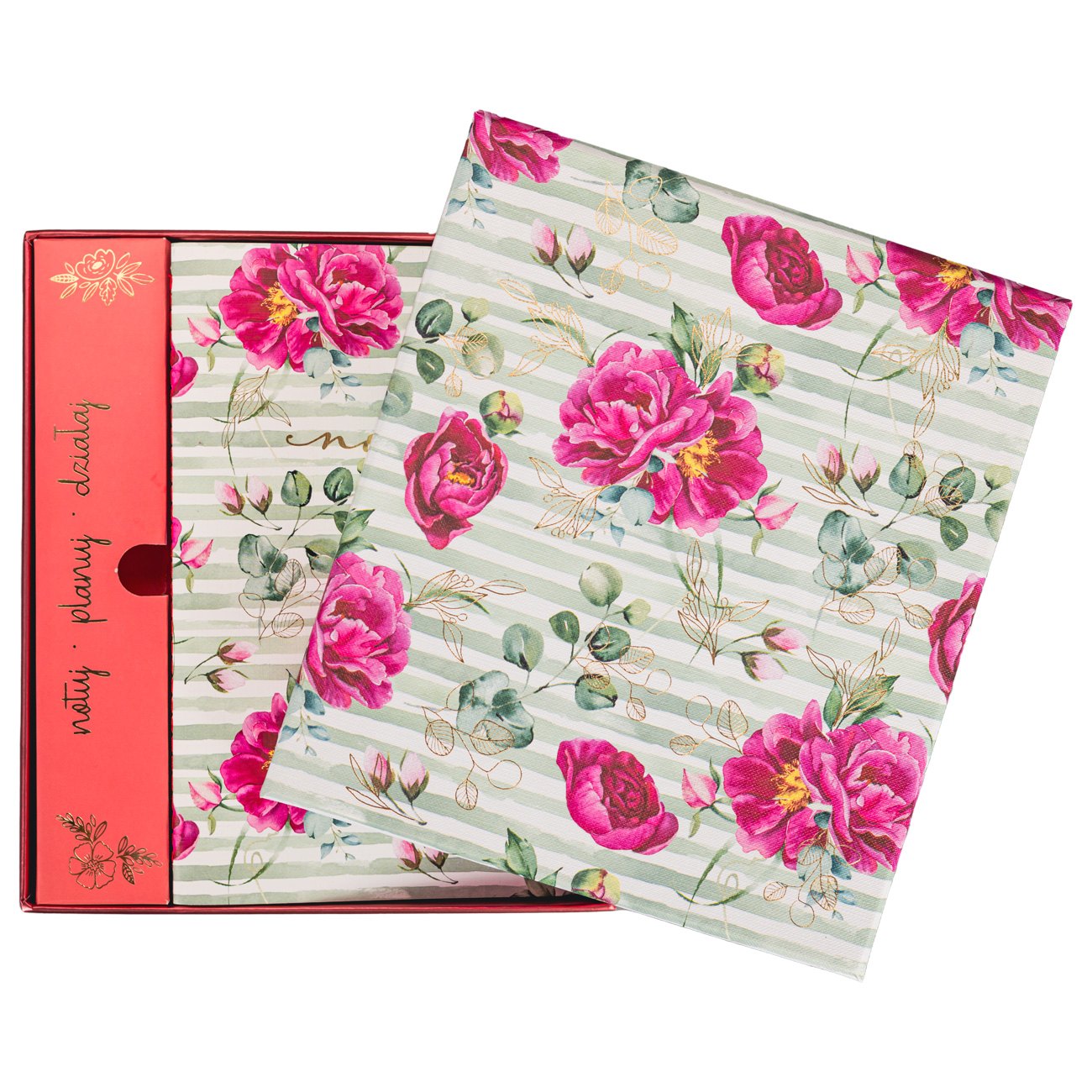 Zestaw prezentowy Lato zawiera pudełko upominkowe z wieczkiem ozdobionym motywem kwiatowym z subtelnymi złoceniami oraz idealnie dobranym kolorem metalizowane spody. Wewnątrz pudełka umieściliśmy pięć różnych, starannie dobranych romantycznych notatników. Kwiatowe okładki zdobione tłoczeniami złotą folią, tworzą piękną kompozycję graficzną, a kolorowe przeszycia grzbietów dopełniają wyjątkowy charakter i podkreślają znaczenie detali. Notatniki sprawdzą się jako pamiętnik, szkicownik lub miejsce na wszelkie codzienne notatki.
