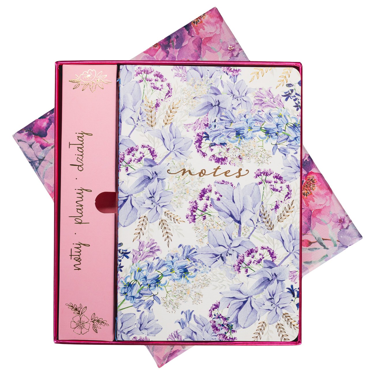 Zestaw prezentowy Miłość zawiera pudełko upominkowe z wieczkiem ozdobionym motywem kwiatowym z subtelnymi złoceniami oraz idealnie dobranym kolorem metalizowane spody. Wewnątrz pudełka umieściliśmy pięć różnych, starannie dobranych romantycznych notatników. Kwiatowe okładki zdobione tłoczeniami złotą folią, tworzą piękną kompozycję graficzną, a kolorowe przeszycia grzbietów dopełniają wyjątkowy charakter i podkreślają znaczenie detali. Notatniki sprawdzą się jako pamiętnik, szkicownik lub miejsce na wszelkie codzienne notatki.