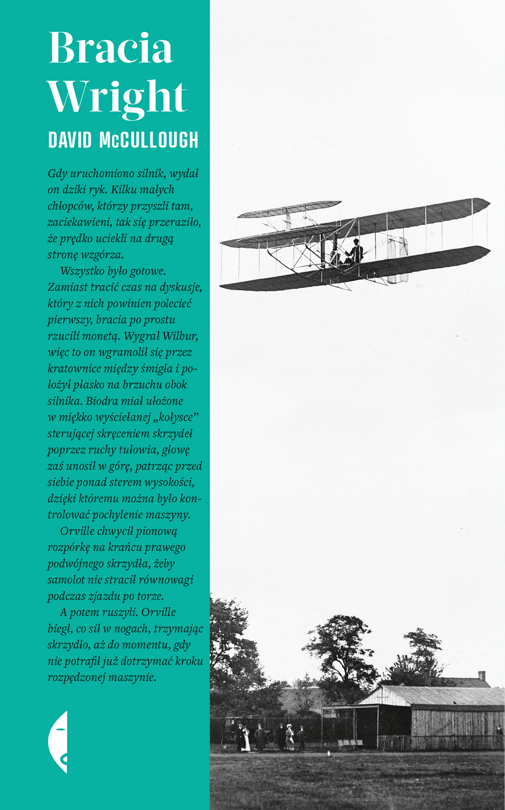 W roku 875 arabski uczony próbował wykorzystać ptasie pióra do stworzenia konstrukcji mającej umożliwić wzbicie się w powietrze. Przez wieki budowano skrzydła i podejmowano próby ich użycia, co nader często kończyło się tragicznie. Pod koniec XV wieku Leonardo da Vinci prowadził poważne studia nad sztuką latania, ale trzeba było poczekać jeszcze ponad czterysta lat, żeby sen stał się rzeczywistością. Dokonali tego dwaj bracia z Ohio: Wilbur i Orville Wright, których w dzieciństwie zafascynował latający bączek. Chłopcy, którzy po matce odziedziczyli talent konstruktorski, a od ojca przejęli wytrwałość, odwagę i siłę charakteru, już wtedy mieli plan zbudowania maszyny latającej. Okazało się, że nie były to tylko dziecięce marzenia. Bracia Wright zapoczątkowali erę lotnictwa. Rada Patronacka Instytutu Smithsona potwierdziła po latach, że to im „należy przypisać zasługę wykonania pierwszego udanego lotu aparatem cięższym od powietrza i napędzanym silnikiem mechanicznym oraz zdolnym unieść człowieka”. Orville przeżył swojego brata Wilbura o trzydzieści sześć lat. Za jego życia w lotnictwie zastosowano napęd odrzutowy, zbudowano pierwsze rakiety i przekroczono barierę dźwięku. 20 lipca 1969 roku Neil Armstrong stanął na Księżycu. Miał ze sobą kawałeczek muślinu ze skrzydła pierwszego aeroplanu braci Wright. David McCullough, dwukrotny laureat Nagrody Pulitzera, opisuje historię Wilbura i Orville’a Wrightów, którzy dzięki swojej odwadze, determinacji i niezwykłej pracowitości dali ludziom możliwość latania. „Senat Stanów Zjednoczonych przerywał obrady, by jego członkowie mogli obejrzeć ich pokaz lotniczy. Gdy startowali swoim flyerem, w niebo patrzyli monarcha brytyjski i syn prezydenta USA. Z Wilburem i Orville’em Wrightami spotkać się chcieli wszyscy, ale oni zamiast spędzać czas w najlepszych hotelach i brylować w towarzystwie, woleli zamknąć się w warsztacie na piętrze sklepu rowerowego, który przez lata prowadzili, i ulepszać swój wynalazek. Pochodzący z niewielkiego miasteczka w stanie Ohio skromni synowie pastora są uosobieniem amerykańskiego snu. Na początku XX wieku skonstruowali samolot napędzany silnikiem spalinowym i jako pierwsi w historii wzbili się nim w powietrze. Ujarzmili przestworza. Ich bratanek napisał, że w domu Wrightów działa się historia, ale była tak dobrze ukryta pod warstwą codzienności, że trudno ją było zauważyć. Dobrze, że David McCullough brawurowo wydobył ją na światło dzienne.” Anna Sulińska „David McCullough pisze o prawdopodobnie najbardziej zaskakującym osiągnięciu ludzkości i robi to z niesłychaną pasją i lekkością. Dzięki niemu bracia Wright znów wzbijają się w powietrze. I to w świetnym stylu.” Daniel Okrent, „The New York Times Book Review” „McCullough stworzył zachwycający portret dwóch skromnych i pracowitych chłopaków z Ohio, którzy w swoim sklepie rowerowym zaprojektowali i skonstruowali samolot, odkrywając następnie tajemnice sztuki latania na plażach Kitty Hawk. Autor uchwycił cudowność dzieła Wrightów, a także jego znaczenie dla późniejszych pokoleń. McCullough jest w swoim żywiole, pisząc o zwykłych ludziach, zaradnych i pełnych amerykańskiej dumy, oraz ich drodze do odkrycia tego, co do tej pory wydawało się niemożliwe.” Roger Lowenstein, „The Wall Street Journal” „Dzięki setkom zachowanych listów, notatek, a także dogłębnemu zrozumieniu, czym Ameryka była w tamtych czasach, McCullough stworzył magiczną książkę o dwóch braciach z Ohio, który nauczyli świat sztuki latania.” Reeve Lindbergh, „The Washington Post” „Wraz z braćmi Wright McCullough wzbija swoją opowieść w powietrze. To rzetelna, porywająca książka, która w pełnej krasie ukazuje doskonały warsztat autora. Koronkowa robota!” Janet Maslin, „The New York Times”