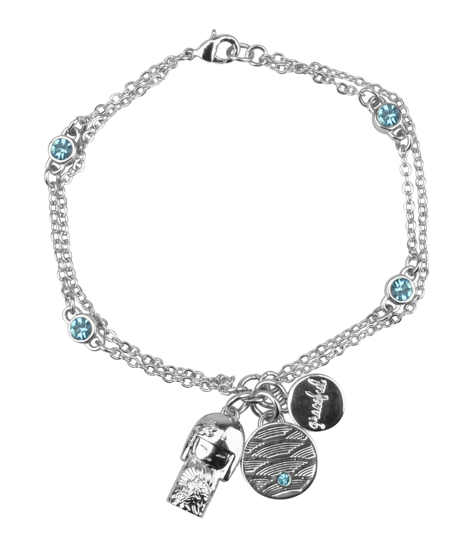 Bransoletka z kolekcji kimmidoll z wizerunkiem kokeshi Miyuna -wdzięczna, posrebrzana, bez dodatku niklu, zdobiona koralikami Swarovskiego z charms-ami.Średnica 9,5 cm x 2 cm,wielkość laleczki 1,5 cm. Pakowana w eleganckie pudełko.