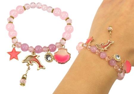 Bransoletka Na Gumce Delfin Gwiazdka Muszelka Różowa Bransoletka na gumce z delfinkiem to niezwykły dodatek dla dzieci, który zachwyca nie tylko swoim urokiem, ale także wygodą noszenia i możliwością dopasowania do każdej rączki. Wykonana z elastycznej gumki, zapewnia komfort noszenia oraz łatwe zakładanie i zdejmowanie. Jej urok tkwi w delikatnych różowych koralikach, które przeplatają się z złotymi elementami, dodając blasku i elegancji. Dodatkowo, zawieszki w kształcie muszelki delfinka i gwiazdki nadają bransoletce niepowtarzalnego wyglądu, inspirując do marzeń o podwodnym świecie i niezwykłych przygodach. Ta bransoletka nie tylko ozdabia rękę, ale także pobudza wyobraźnię i rozwija poczucie estetyki u dzieci. Daje im możliwość wyrażania swojego stylu i osobowości poprzez noszenie czegoś wyjątkowego i jednocześnie zabawnego. Idealna propozycja dla małych fanek ozdób i mody, ta bransoletka na gumce z delfinkiem to doskonały prezent na różne okazje, który sprawi radość każdej dziewczynce, dodając jej stylu i uroku. Wymiary opakowania: 9,5cm x 8cm x 1cm Posiada certyfikat CE, ponadto jest zgodny z normą EN71. Przeznaczony dla dzieci powyżej 3 roku życia.