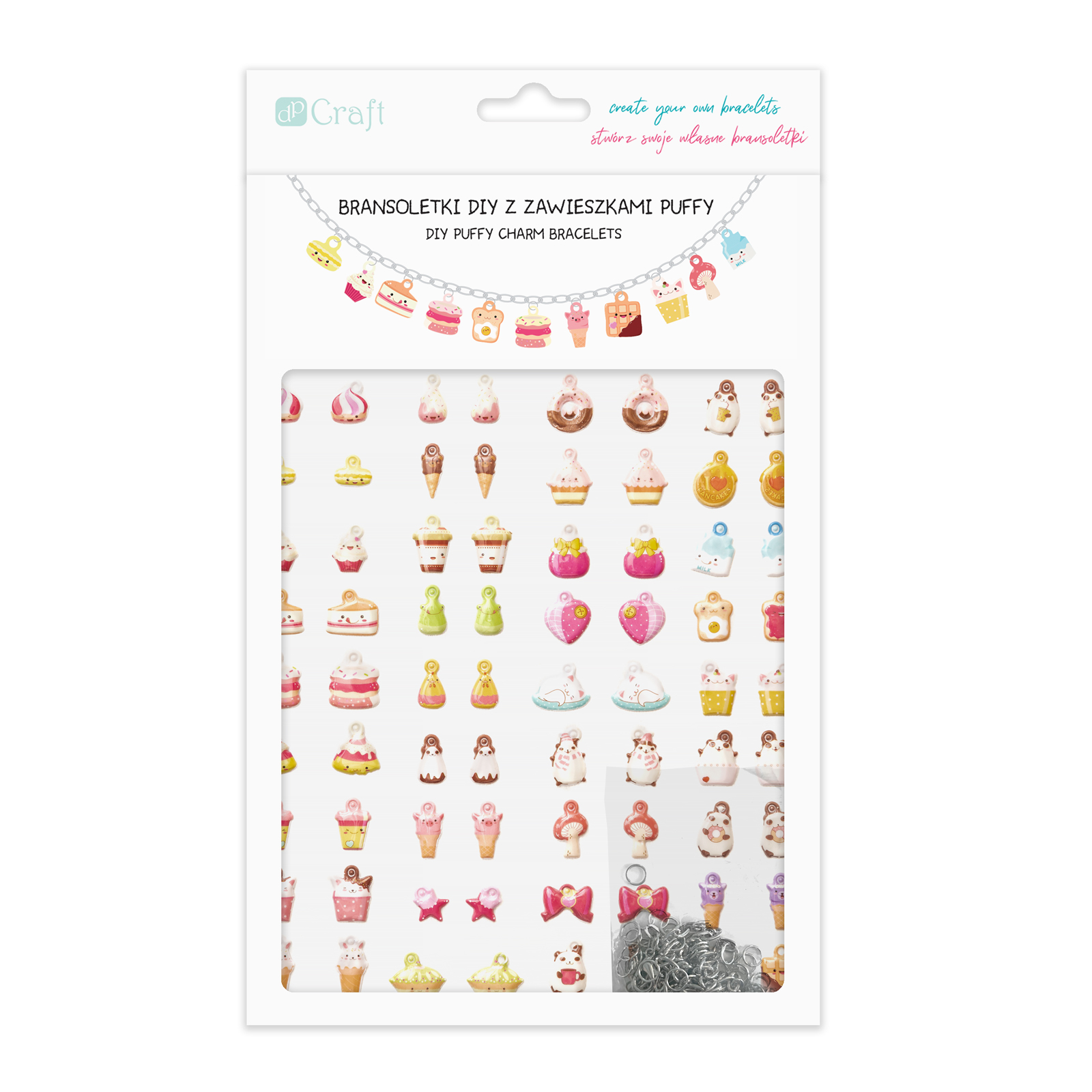 Zestaw do tworzenia bransoletek Sweeties zawiera 36 kolorowych charmsów, w postaci puchatych naklejek, które zachwycą dzieci i pozwolą im stworzyć spersonalizowaną biżuterię. Mogą wybierać i komponować wzory spośród ślicznych, kolorowych zwierzątek i słodkości.