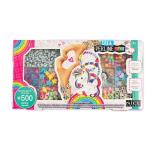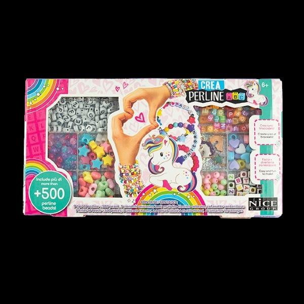 ZAWARTOŚĆ: 500 sztuk i 10 metrów elastycznego sznurka w różnych kolorach. Specjalne koraliki, w tym: gwiazdki, serca, motyle, 3 rodzaje koralików ABC i 3 zawieszki jednorożca.