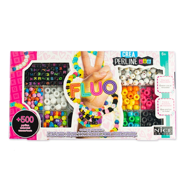 ZAWARTOŚĆ: zamykany pojemnik z przegródkami zawierający 500 koralików ABC różnych typów (zwykłych i neonowych), 5 m gumki.