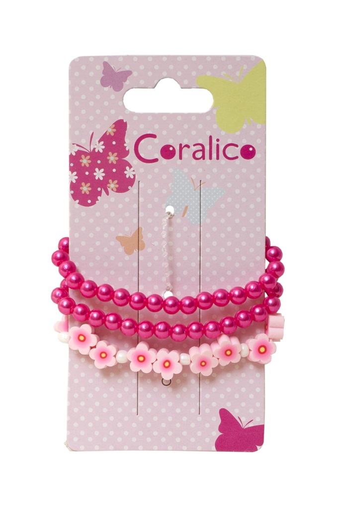 Zestaw trzech bransoletek z kwiatkami. Bransoletki w odcieniach różu.