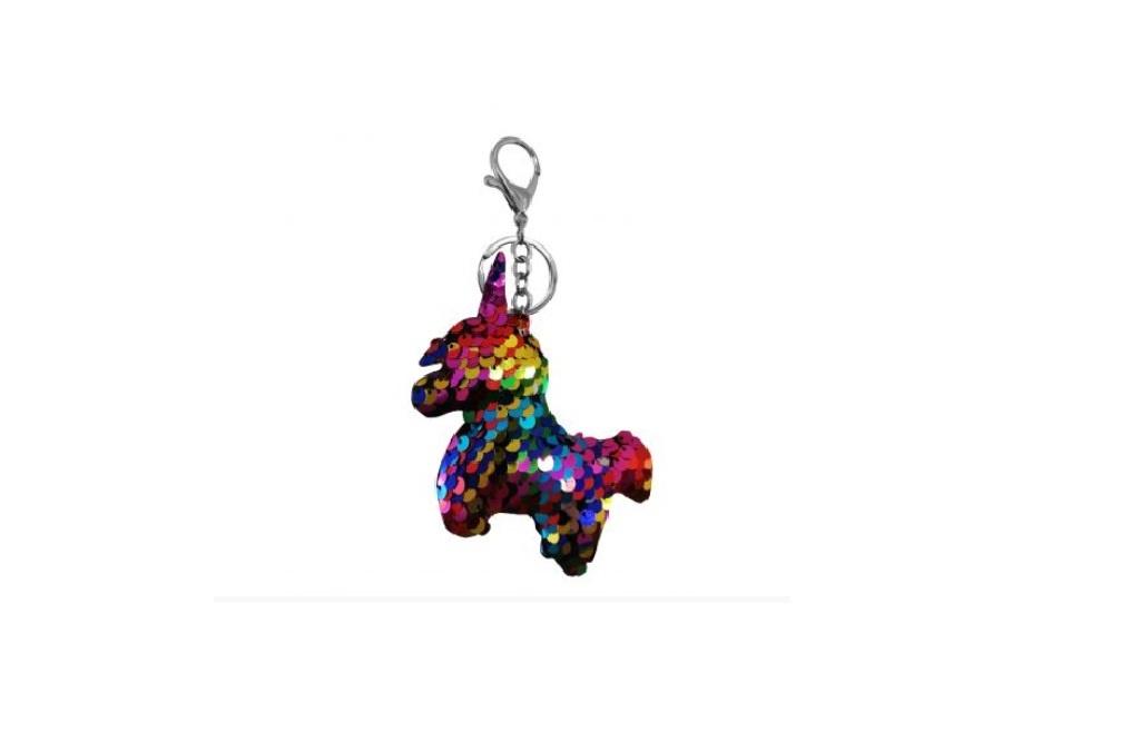 Cekinowy breloczek w kolorach tęczy w kształcie jednorożca.