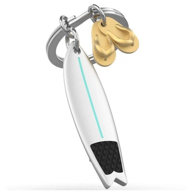 Brelok do kluczy w kształcie deski surfingowej i klapek to świetny, wakacyjny dodatek, który przywodzi na myśl plażę, morze i letnią swobodę.