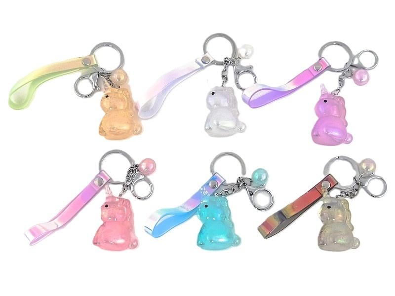 brelok jednorożec, wys.5,5cm, przezroczysty z płynnym brokatem, z zawieszką neonową, całość 16cm,