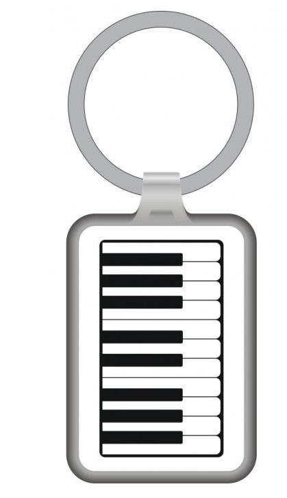Metalowy brelok z motywem muzycznym - z przodu czarno-biała klawiatura, z tyłu klucz wiolinowy i napis ""All I need is music"". Wymiary 3x7,5 cm.
