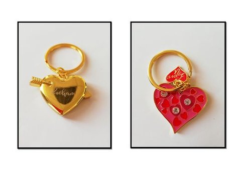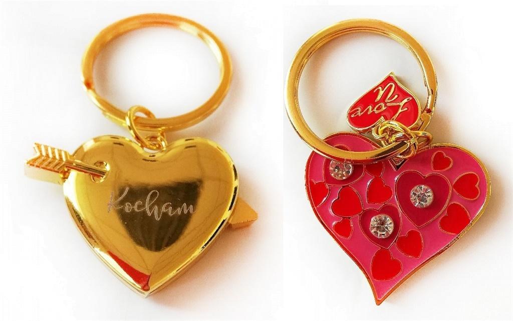 Dostępne dwa wzory - wysyłamy losowo. "Metalowy brelok w kształcie serca przebitego strzałą, ze specjalnym grawerem Kocham. Brelok w kolorze złota. Doskonale sprawdzi się jako upominek na walentynki, jak również na inne okazje. Idealny dodatek do kluczy, torebki, plecaka." "Metalowy brelok w kształcie serca ze specjalnym grawerem Kocham na odwrocie oraz mniejszej zawieszki, również w kształcie serca. Brelok w kolorze złota, pokryty dodatkową wzorem w serca z dodatkiem małych kryształków. Doskonale sprawdzi się jako upominek na walentynki, jak również na inne okazje. Idealny dodatek do kluczy, torebki, plecaka. "